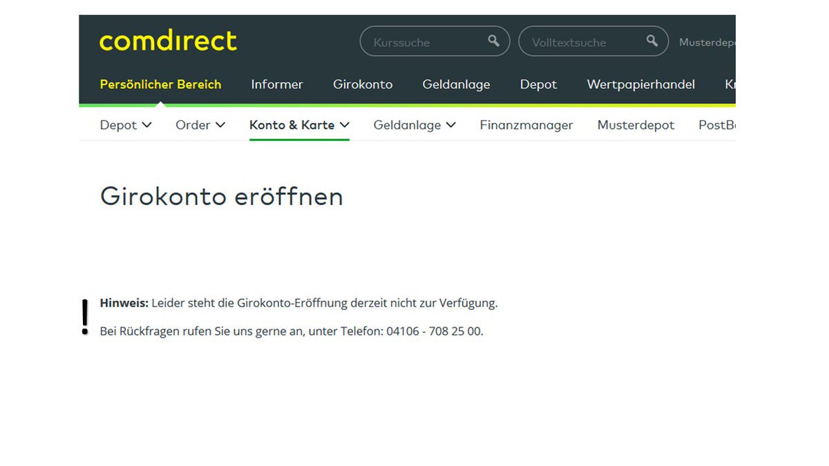Telefon +49 69 136 22830 fax +49 69 136 22008 pressemitteilung commerzbank schließt komplettübernahme der comdirect ab die commerzbank hat die komplettübernahme der comdirect bank aktiengesellschaft („comdirect) erfolgreich abgeschlossen. Unsere webseite steht ihnen mit allen funktionen auch jederzeit mobil unter www.comdirect.de zur verfügung. Ob sie mit wenigen klicks ihre überweisung ausführen, ihre wertpapierorders an die börse bringen oder ihre persönliche anlagestrategie optimieren wollen. The comdirect mobile app offers you optimized access to selected web functions. Geben sie jetzt die erste bewertung ab! Sie müssen mindestens ein bild hochladen. Zu den produkten zählten beispielsweise ein girokonto und ein. Our website is also available to you at any time on www.comdirect.de. Kostenlose produkthotline unter 0800 55 05 600. Ich habe kurz danach aufgehört dieses konto zu benutzen weil mir das zu blöd war immer die 60,23 zu unrecht(liegt beim anwalt) still gelegten euro zu sehen. Im laufe der jahre entwickelte sich das institut immer stärker zur universalbank. November 2020 wurde die verschmelzung ins handelsregister Angenehm freundliche, sympathische, motivierte und kompetente personen jeweils am telefon.